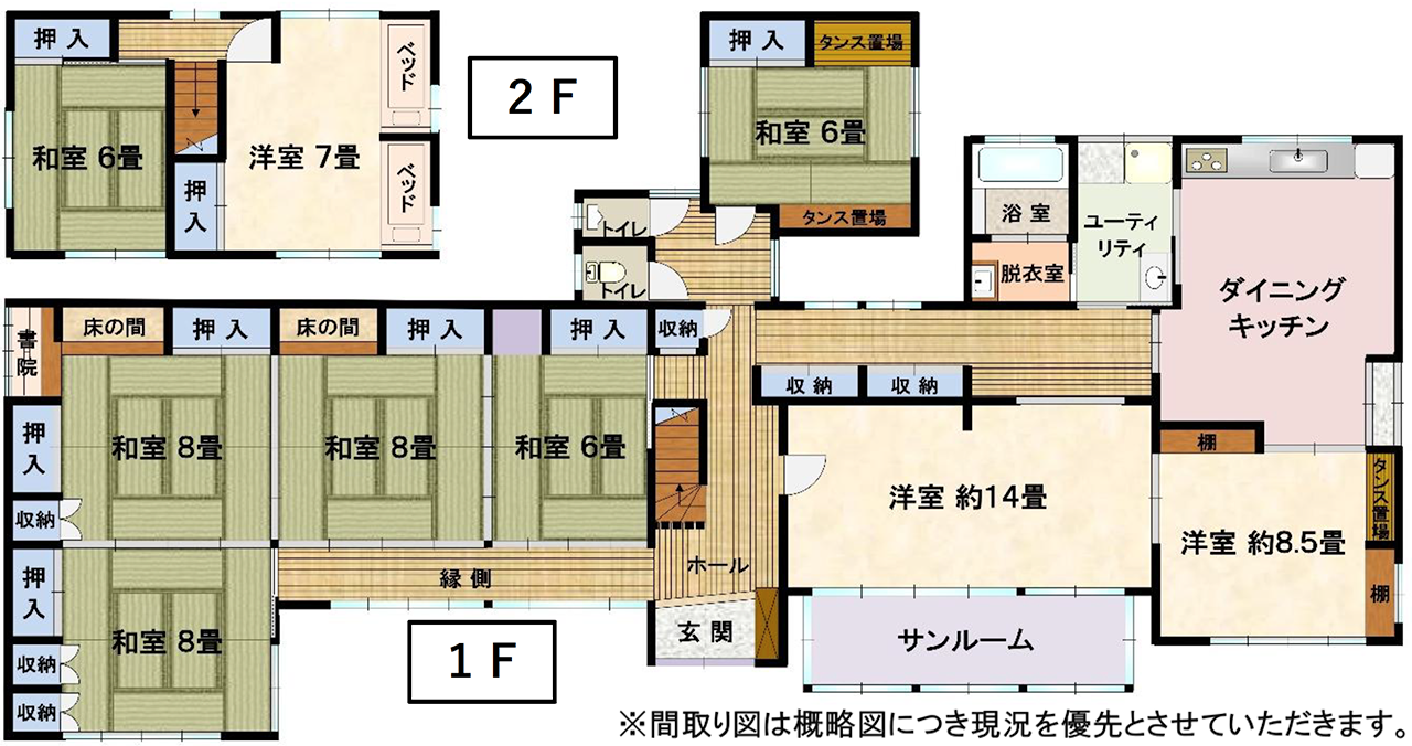| 床面積 | 1階 189.28㎡(57.25坪) 2階 202.51㎡(10.01坪) 合計 222.40㎡(67.26坪) |